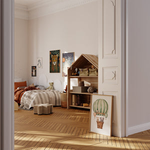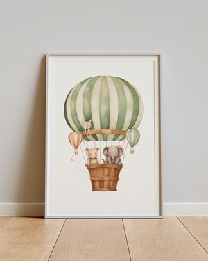 Een olifant, beer en poes zweven samen hoog in de lucht in een zachte luchtballon vol avontuur. Balloon Buddies is een lieve en fantasierijke kinderkamerposter die perfect past in een dromerig, zacht interieur. Ideaal als muurdecoratie voor baby- of peuterkamers vol verbeelding en vriendschap.