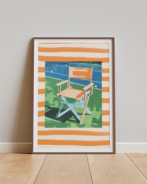 Poster Baseline Break – Tennisstoel op oranje baan