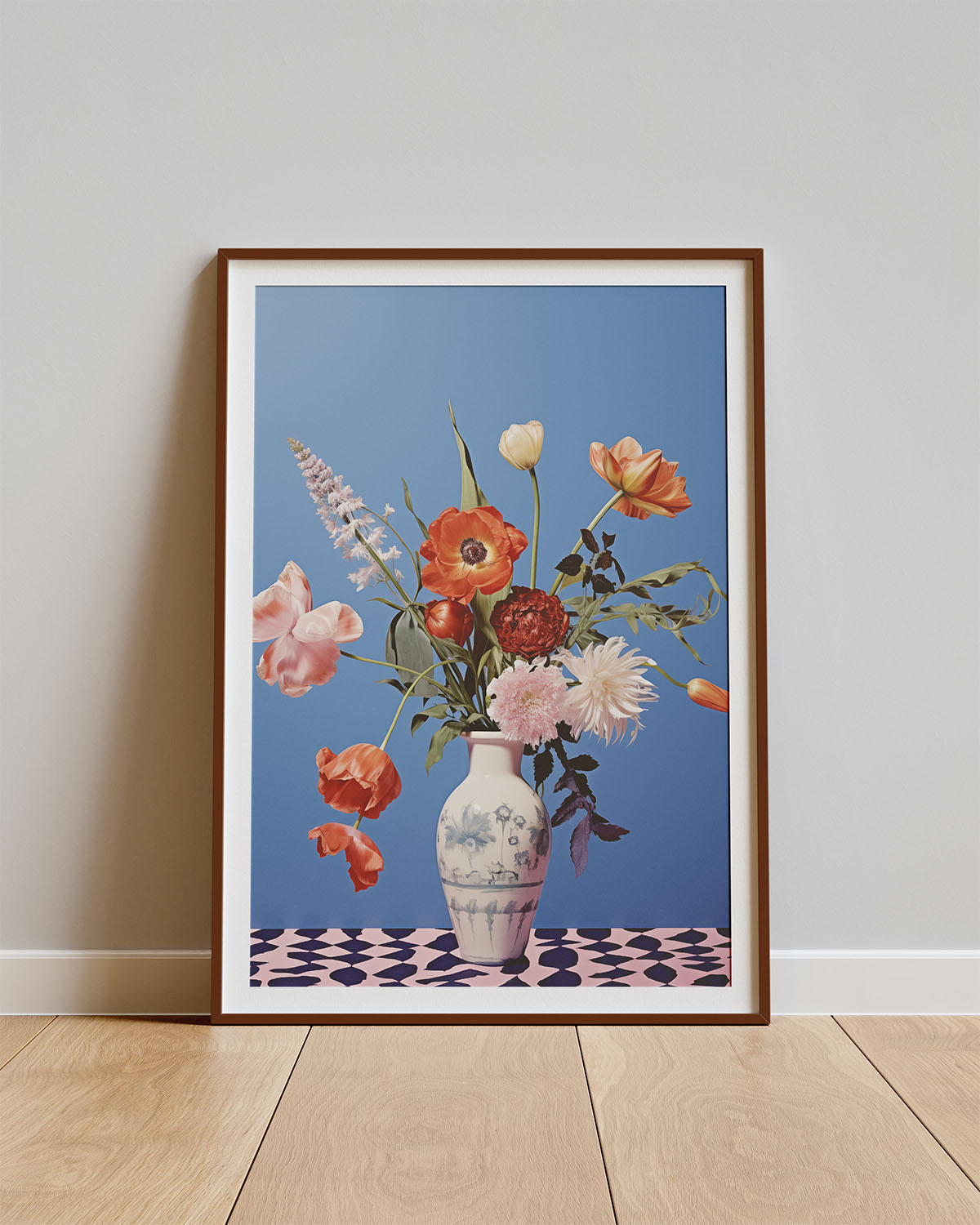Het tweede beeld in de serie: Bloom Vase Blue II toont een nieuwe compositie van bloemen op dezelfde rijke blauwe achtergrond. Combineer deze poster met Bloom Vase Blue I voor een evenwichtige, verfijnde look aan je muur.