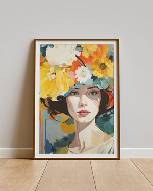 Een krachtige vrouw met een zachte blik, omlijst door een weelderige bloemenkrans. Blooming Gaze is een kleurrijke en expressieve poster die vrouwelijkheid, rust en creativiteit samenbrengt. Perfect als artistiek statement aan de muur, in een interieur dat durft te bloeien.