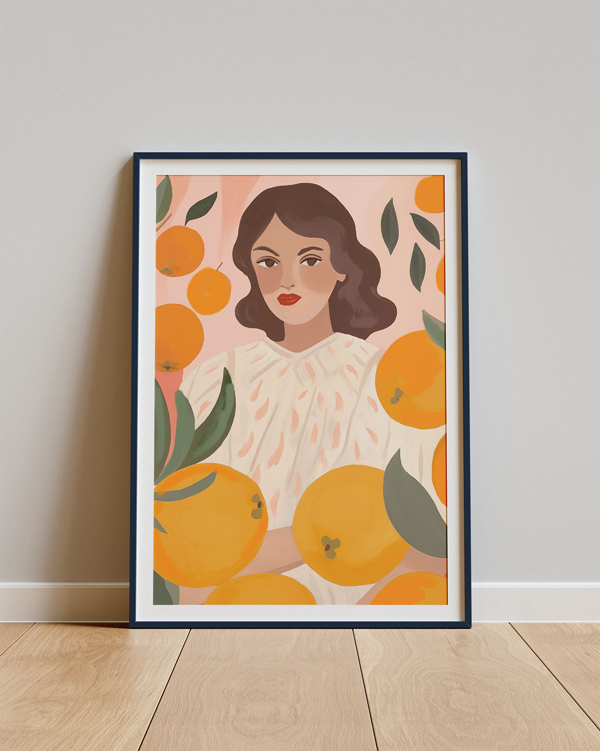 Een dromerige vrouw, omlijst door sinaasappels en zachte kleurvlakken. Citrus Muse combineert vrouwelijke charme met mediterrane frisheid; een stijlvolle poster die warmte en verfijning toevoegt aan je interieur.