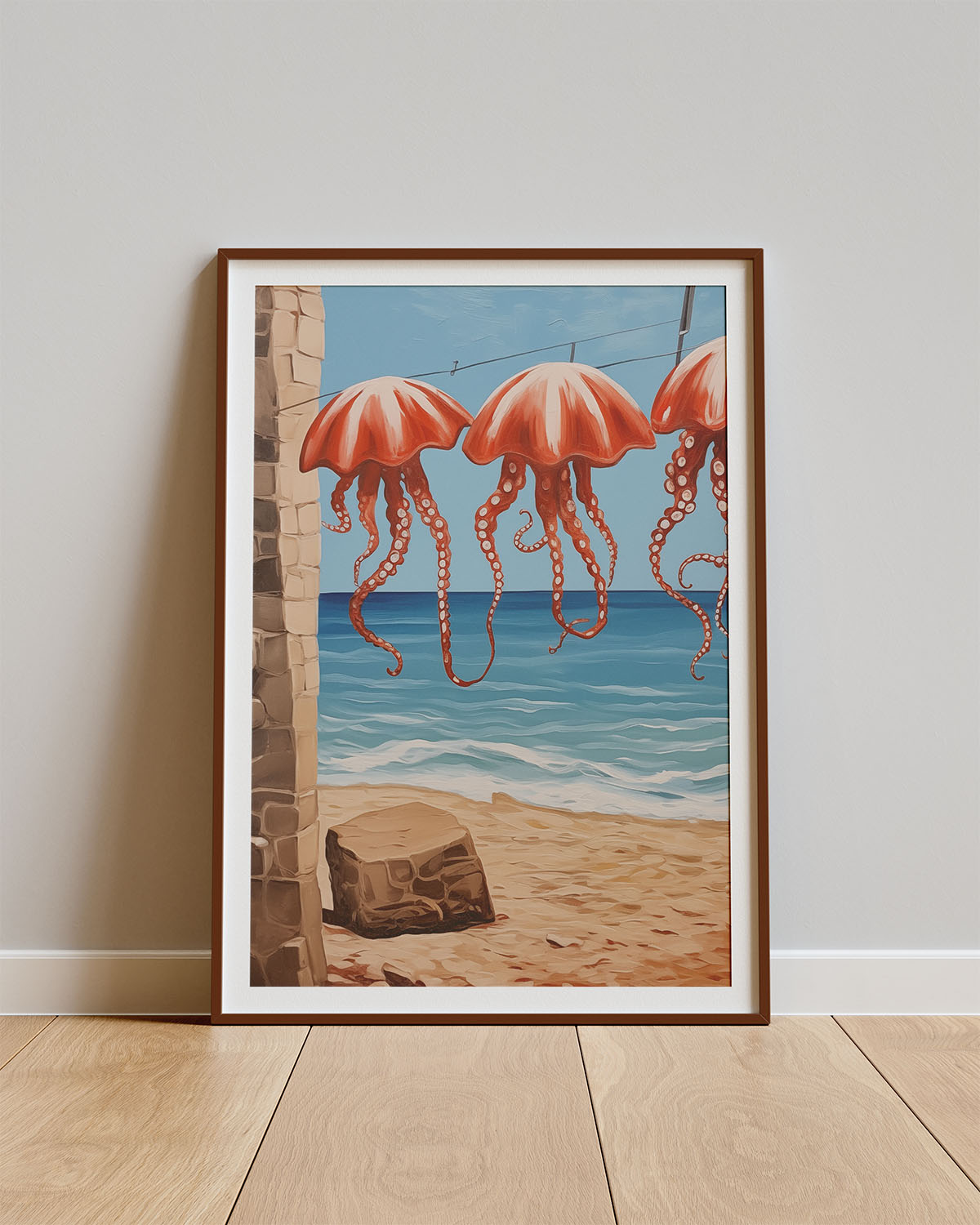 Een speels en kunstzinnig beeld van kwallen die zachtjes deinen aan een waslijn, met de zee op de achtergrond. Jelly Breeze is een verrassende poster die een vleugje humor en creativiteit toevoegt aan je muur. Perfect voor liefhebbers van originele wanddecoratie.