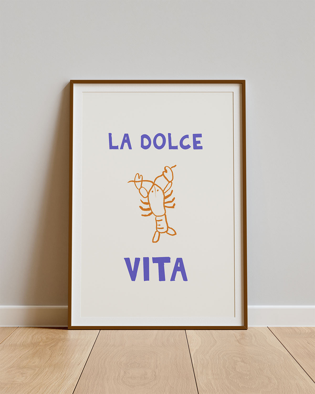 Met een knipoog naar Italiaanse zeevruchten en stranddagen brengt La Dolce Lobster een elegante kreeftillustratie in een losse schetsstijl. Deze zomerse poster is een opvallende keuze voor de keuken of eetkamer; een originele mix van kunst, humor en kustsfeer.