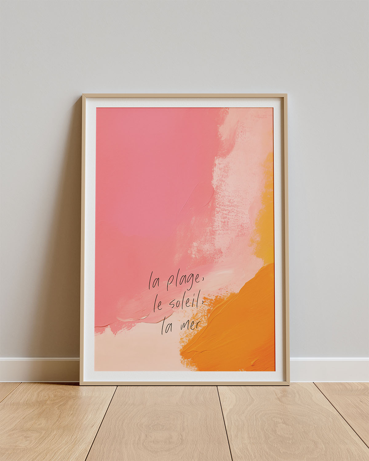 Een kleurenpalet dat ruikt naar zonnebrand, zand en zinderende middagen aan zee. Deze poster combineert zachte tinten met subtiele Franse flair – la plage, le soleil, la mer. Dat is alles wat je nodig hebt, toch?