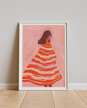Poster Rosso Stripes – Vrouw in gestreepte jurk op roze achtergrond