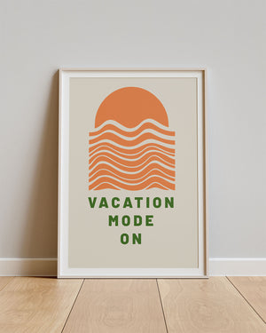 Wanneer de zon zakt, gaat de vacation mode aan. Deze minimalistische vectorposter toont een warme oranje zonsondergang boven zachte typografie in het groen. Een subtiele maar krachtige blikvanger voor iedereen die snakt naar rust en verre oorden – of gewoon een beetje dagdroomt aan het bureau.