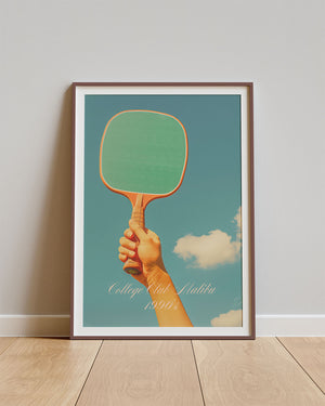 Deze poster toont een gestileerde illustratie van een pingpongbatje met de tekst College Club Malibu 1990 – in warme kleuren en minimalistische stijl. Perfect voor sportieve interieurs, een tienerkamer of als speels accent in een moderne gallery wall.